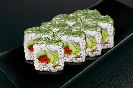 Рис, нори, чука, авокадо, перец сладкий, кунжут.