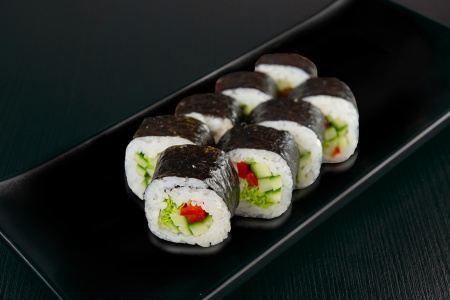 Рис, нори, огурец, чука, перец сладкий, кунжут.